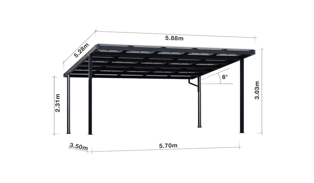 Die hochwertige Aluminiumkonstruktion ist korrosionsbeständig, langlebig und besonders wartungsarm. Dank der statisch geprüften Bauweise ist der Solarcarport für unterschiedliche Schneelasten ausgelegt und eignet sich damit für verschiedene Regionen und klimatische Bedingungen.
